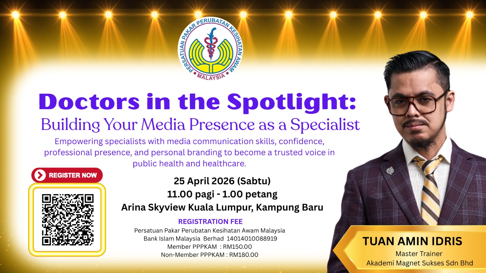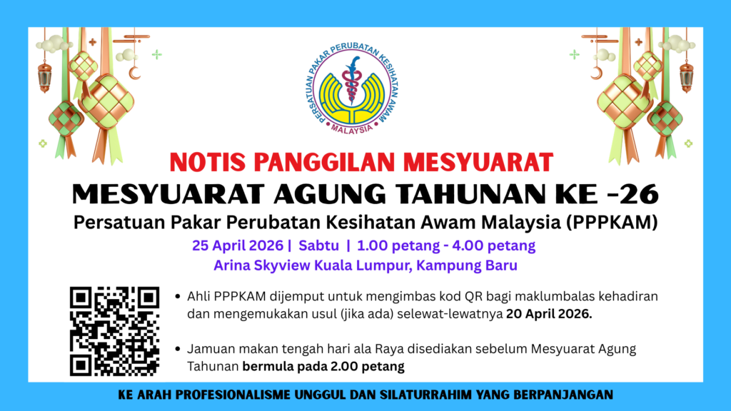 bERBAKTI KE ARAH KESEJAHTERAAN MASYARAKATRecent News & ArticlesISU PENGGUNAAN PrEP: PENDEKATAN SAINTIFIK DAN STRATEGI PENCEGAHAN, BUKAN GALAKAN KEPADA GEJALA SOSIALDecember 26, 2025 Read More KERJASAMA PPPKAM BERSAMA STUDIO SIHAT – Siri 1November 18, 2025 Read More AI WORKSHOP: FROM FUNDAMENTALS TO PRACTICAL APPLICATION IN PUBLIC HEALTHNovember 18, 2025 Read More Webinar Introduction to Public Health Medicine Subspecialties: Occupational Health & Family HealthOctober 30, 2025 Read More INTRODUCTION TO PUBLIC HEALTH MEDICINE SUBSPECIALTIES: ENVIRONMENTAL HEALTH & COMMUNICABLE DISEASESOctober 22, 2025 Read More Webinar Introduction to Public Health Medicine Subspecialties : Non-Communicable Diseases & Health ManagementSeptember 19, 2025 Read More Membership Events