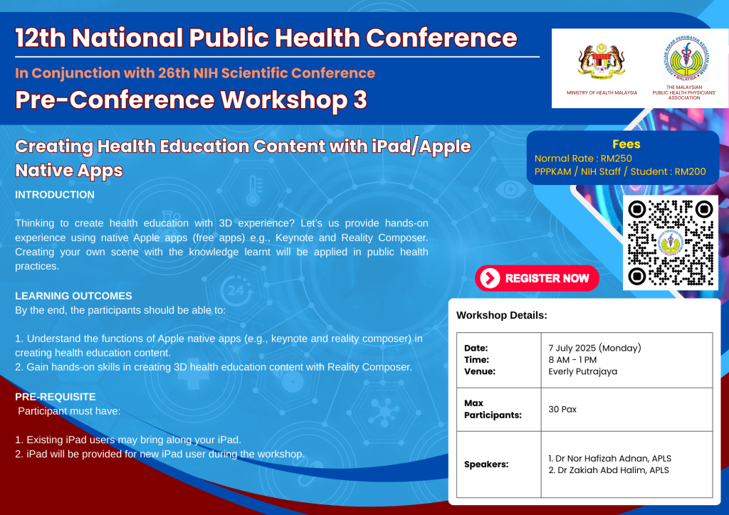 Thinking to create health education with 3D experience? Let’s us provide hands-on experience using native Apple apps (free apps) e.g., Keynote and Reality Composer. Creating your own scene with the knowledge learnt will be applied in public health practices.