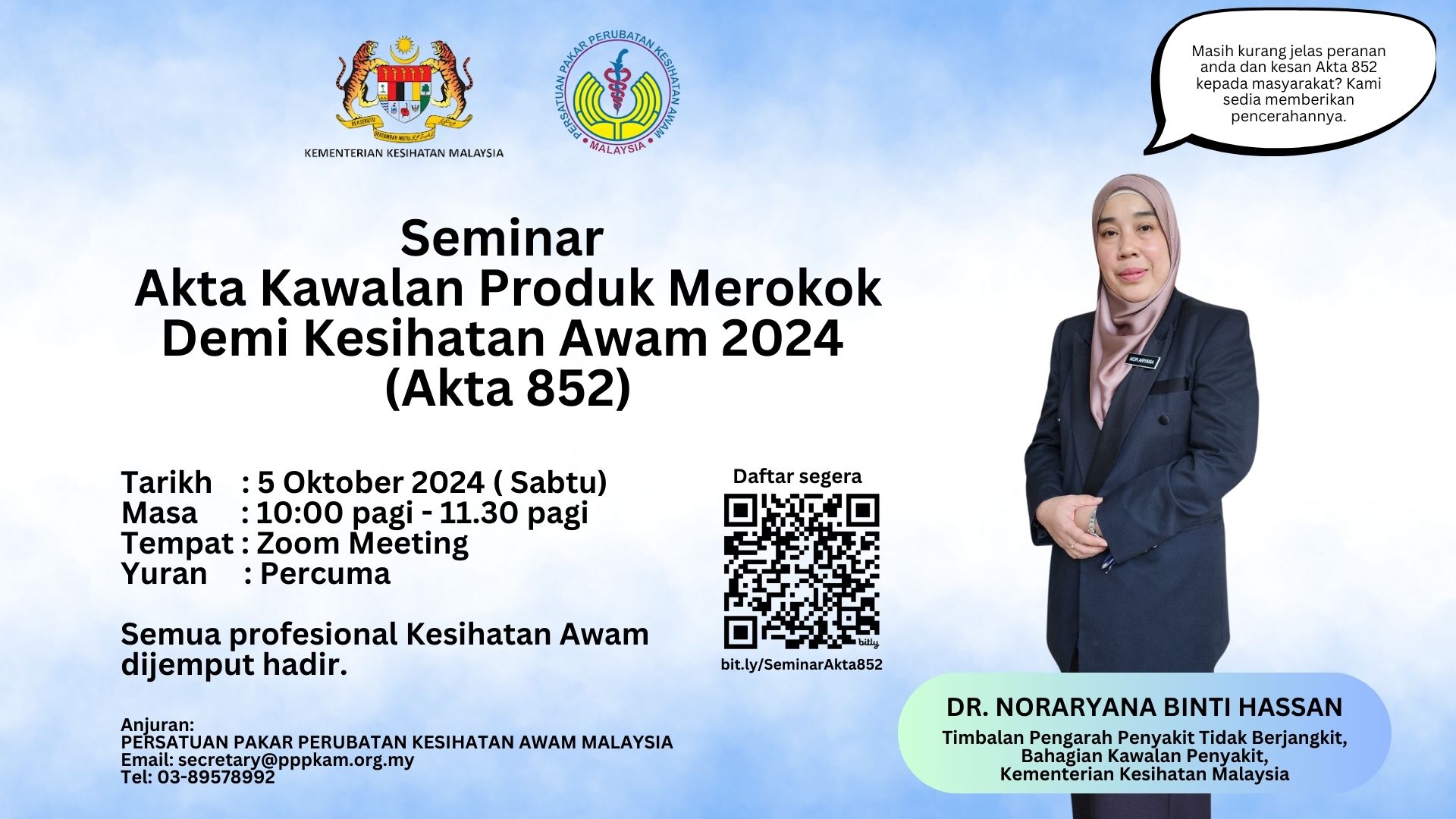 Semua profesional Kesihatan Awam dijemput untuk menghadiri Seminar Akta Kawalan Produk Merokok Demi Kesihatan Awam 2024 (Akta 852) anjuran Persatuan Perubatan Kesihatan Awam Malaysia yang akan diadakan seperti berikut:-