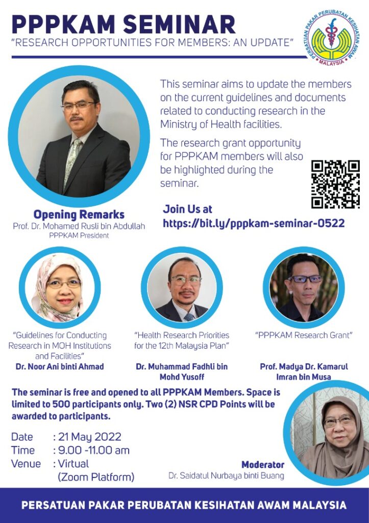 “RESEARCH OPPORTUNITIES FOR MEMBERS: AN UPDATE” seminar aims to inculcate research culture among PPPKAM members. This seminar will provide an update on latest the updated Guidelines in conducting research in Ministry of Health facilities, while also highlighting the research priority areas for 12th Malaysian Plan.