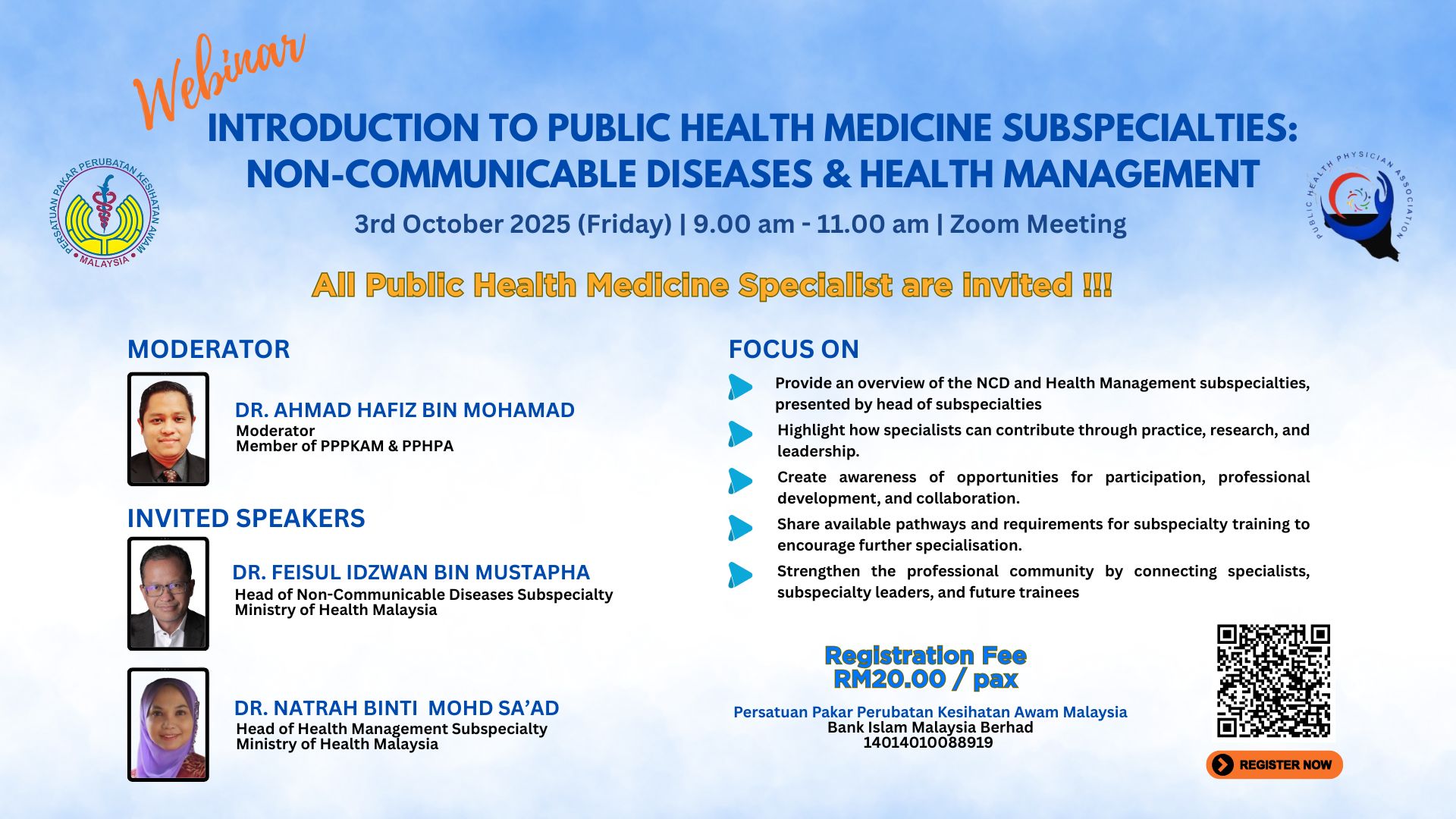 Jemputan kepada semua Pakar Perubatan Kesihatan Awam (PPKA) bagi menyertai webinar Introduction to Public Health Medicine Subspecialties : Non-Communicable Diseases & Health Management anjuran Persatuan Pakar Perubatan Kesihatan Awam Malaysia (PPPKAM) dan Pahang Public Health Physician Association (PPHPA). Webinar akan berlangsung seperti berikut:-